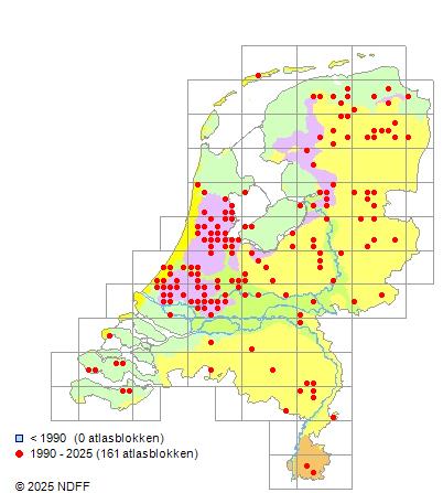 Het aantal atlasblokken (5x5 km) waarin de soort is gemeld binnen een periode van vijf jaar (vanaf 1980) of twintig jaar. Niet gecorrigeerd voor waarnemersinspanning en het aantal doorgegeven waarnemingen kan sterk variëren per periode, dus een trend in verspreiding kan hier niet direct uit worden afgelezen. Het opgegeven jaartal is het eerste jaar van de periode. Bron: gevalideerde waarnemingen uit de NDFF.