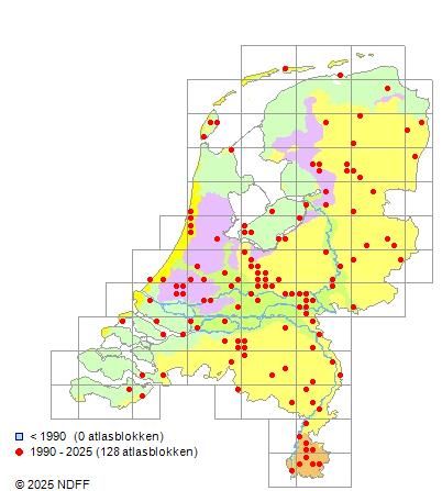 Het aantal atlasblokken (5x5 km) waarin de soort is gemeld binnen een periode van vijf jaar (vanaf 1980) of twintig jaar. Niet gecorrigeerd voor waarnemersinspanning en het aantal doorgegeven waarnemingen kan sterk variëren per periode, dus een trend in verspreiding kan hier niet direct uit worden afgelezen. Het opgegeven jaartal is het eerste jaar van de periode. Bron: gevalideerde waarnemingen uit de NDFF.