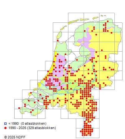 Het aantal atlasblokken (5x5 km) waarin de soort is gemeld binnen een periode van vijf jaar (vanaf 1980) of twintig jaar. Niet gecorrigeerd voor waarnemersinspanning en het aantal doorgegeven waarnemingen kan sterk variëren per periode, dus een trend in verspreiding kan hier niet direct uit worden afgelezen. Het opgegeven jaartal is het eerste jaar van de periode. Bron: gevalideerde waarnemingen uit de NDFF.
