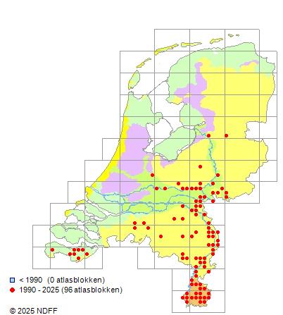 Het aantal atlasblokken (5x5 km) waarin de soort is gemeld binnen een periode van vijf jaar (vanaf 1980) of twintig jaar. Niet gecorrigeerd voor waarnemersinspanning en het aantal doorgegeven waarnemingen kan sterk variëren per periode, dus een trend in verspreiding kan hier niet direct uit worden afgelezen. Het opgegeven jaartal is het eerste jaar van de periode. Bron: gevalideerde waarnemingen uit de NDFF.