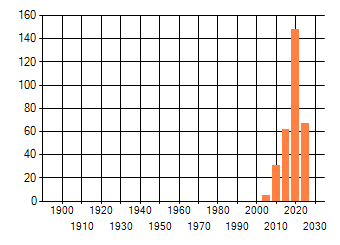 Het aantal atlasblokken (5x5 km) waarin de soort is gemeld binnen een periode van vijf jaar (vanaf 1980) of twintig jaar. Niet gecorrigeerd voor waarnemersinspanning en het aantal doorgegeven waarnemingen kan sterk variëren per periode, dus een trend in verspreiding kan hier niet direct uit worden afgelezen. Het opgegeven jaartal is het eerste jaar van de periode. Bron: gevalideerde waarnemingen uit de NDFF.