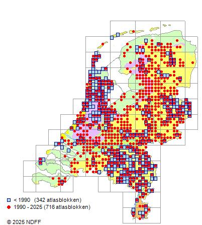 Het aantal atlasblokken (5x5 km) waarin de soort is gemeld binnen een periode van vijf jaar (vanaf 1980) of twintig jaar. Niet gecorrigeerd voor waarnemersinspanning en het aantal doorgegeven waarnemingen kan sterk variëren per periode, dus een trend in verspreiding kan hier niet direct uit worden afgelezen. Het opgegeven jaartal is het eerste jaar van de periode. Bron: gevalideerde waarnemingen uit de NDFF.