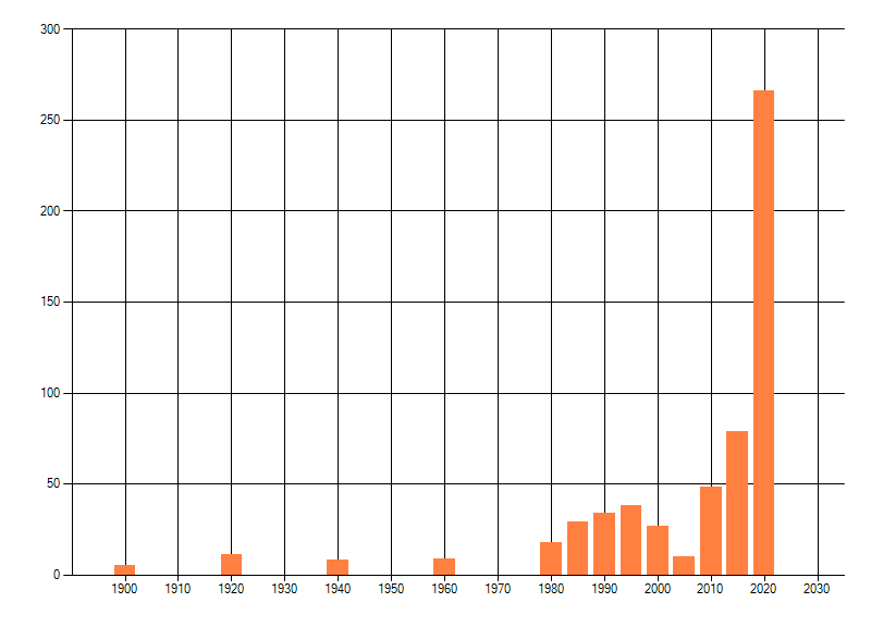 Het aantal atlasblokken (5x5 km) waarin de soort is gemeld binnen een periode van vijf jaar (vanaf 1980) of twintig jaar. Niet gecorrigeerd voor waarnemersinspanning en het aantal doorgegeven waarnemingen kan sterk variëren per periode, dus een trend in verspreiding kan hier niet direct uit worden afgelezen. Het opgegeven jaartal is het eerste jaar van de periode. Bron: gevalideerde waarnemingen uit de NDFF.
