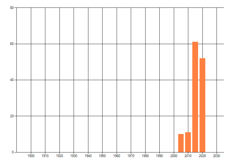 Het aantal atlasblokken (5x5 km) waarin de soort is gemeld binnen een periode van vijf jaar (vanaf 1980) of twintig jaar. Niet gecorrigeerd voor waarnemersinspanning en het aantal doorgegeven waarnemingen kan sterk variëren per periode, dus een trend in verspreiding kan hier niet direct uit worden afgelezen. Het opgegeven jaartal is het eerste jaar van de periode. Bron: gevalideerde waarnemingen uit de NDFF.