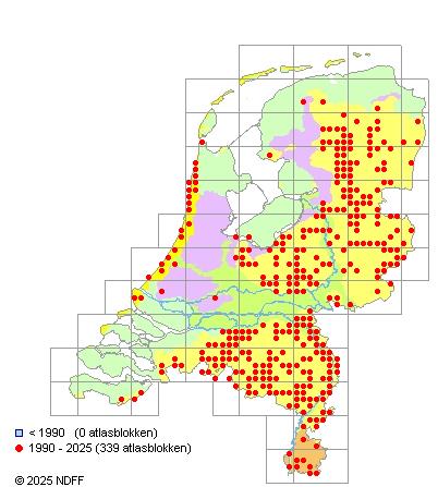 Het aantal atlasblokken (5x5 km) waarin de soort is gemeld binnen een periode van vijf jaar (vanaf 1980) of twintig jaar. Niet gecorrigeerd voor waarnemersinspanning en het aantal doorgegeven waarnemingen kan sterk variëren per periode, dus een trend in verspreiding kan hier niet direct uit worden afgelezen. Het opgegeven jaartal is het eerste jaar van de periode. Bron: gevalideerde waarnemingen uit de NDFF.