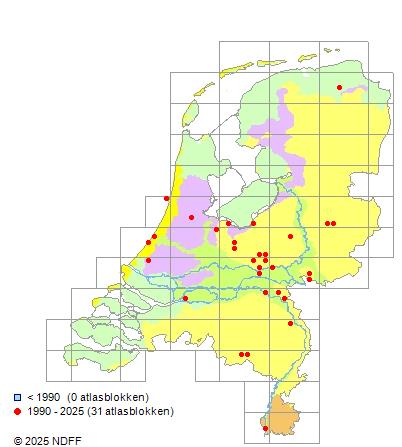 Het aantal atlasblokken (5x5 km) waarin de soort is gemeld binnen een periode van vijf jaar (vanaf 1980) of twintig jaar. Niet gecorrigeerd voor waarnemersinspanning en het aantal doorgegeven waarnemingen kan sterk variëren per periode, dus een trend in verspreiding kan hier niet direct uit worden afgelezen. Het opgegeven jaartal is het eerste jaar van de periode. Bron: gevalideerde waarnemingen uit de NDFF.