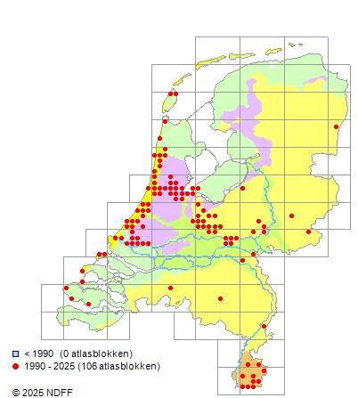 Het aantal atlasblokken (5x5 km) waarin de soort is gemeld binnen een periode van vijf jaar (vanaf 1980) of twintig jaar. Niet gecorrigeerd voor waarnemersinspanning en het aantal doorgegeven waarnemingen kan sterk variëren per periode, dus een trend in verspreiding kan hier niet direct uit worden afgelezen. Het opgegeven jaartal is het eerste jaar van de periode. Bron: gevalideerde waarnemingen uit de NDFF.