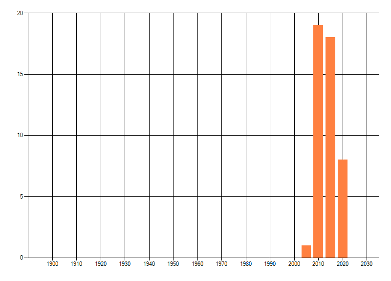 Het aantal atlasblokken (5x5 km) waarin de soort is gemeld binnen een periode van vijf jaar (vanaf 1980) of twintig jaar. Niet gecorrigeerd voor waarnemersinspanning en het aantal doorgegeven waarnemingen kan sterk variëren per periode, dus een trend in verspreiding kan hier niet direct uit worden afgelezen. Het opgegeven jaartal is het eerste jaar van de periode. Bron: gevalideerde waarnemingen uit de NDFF.