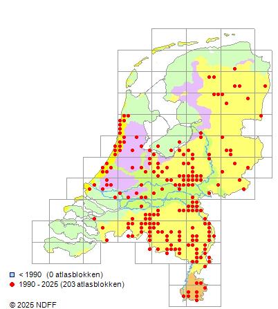 Het aantal atlasblokken (5x5 km) waarin de soort is gemeld binnen een periode van vijf jaar (vanaf 1980) of twintig jaar. Niet gecorrigeerd voor waarnemersinspanning en het aantal doorgegeven waarnemingen kan sterk variëren per periode, dus een trend in verspreiding kan hier niet direct uit worden afgelezen. Het opgegeven jaartal is het eerste jaar van de periode. Bron: gevalideerde waarnemingen uit de NDFF.