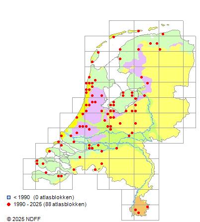 Het aantal atlasblokken (5x5 km) waarin de soort is gemeld binnen een periode van vijf jaar (vanaf 1980) of twintig jaar. Niet gecorrigeerd voor waarnemersinspanning en het aantal doorgegeven waarnemingen kan sterk variëren per periode, dus een trend in verspreiding kan hier niet direct uit worden afgelezen. Het opgegeven jaartal is het eerste jaar van de periode. Bron: gevalideerde waarnemingen uit de NDFF.