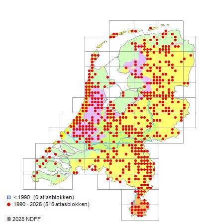 Het aantal atlasblokken (5x5 km) waarin de soort is gemeld binnen een periode van vijf jaar (vanaf 1980) of twintig jaar. Niet gecorrigeerd voor waarnemersinspanning en het aantal doorgegeven waarnemingen kan sterk variëren per periode, dus een trend in verspreiding kan hier niet direct uit worden afgelezen. Het opgegeven jaartal is het eerste jaar van de periode. Bron: gevalideerde waarnemingen uit de NDFF.