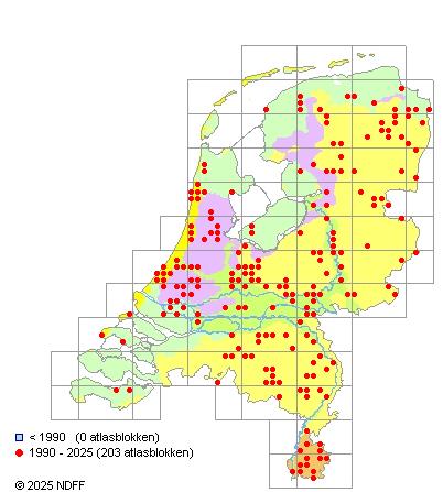 Het aantal atlasblokken (5x5 km) waarin de soort is gemeld binnen een periode van vijf jaar (vanaf 1980) of twintig jaar. Niet gecorrigeerd voor waarnemersinspanning en het aantal doorgegeven waarnemingen kan sterk variëren per periode, dus een trend in verspreiding kan hier niet direct uit worden afgelezen. Het opgegeven jaartal is het eerste jaar van de periode. Bron: gevalideerde waarnemingen uit de NDFF.