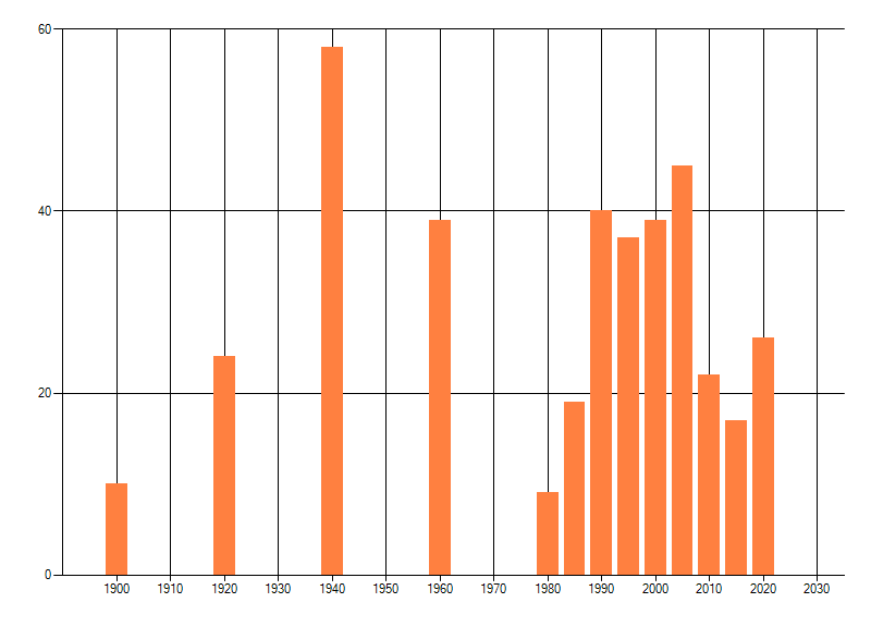 Het aantal atlasblokken (5x5 km) waarin de soort is gemeld binnen een periode van vijf jaar (vanaf 1980) of twintig jaar. Niet gecorrigeerd voor waarnemersinspanning en het aantal doorgegeven waarnemingen kan sterk variëren per periode, dus een trend in verspreiding kan hier niet direct uit worden afgelezen. Het opgegeven jaartal is het eerste jaar van de periode. Bron: gevalideerde waarnemingen uit de NDFF.