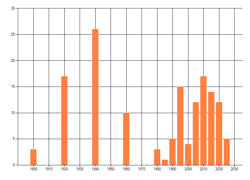 Het aantal atlasblokken (5x5 km) waarin de soort is gemeld binnen een periode van vijf jaar (vanaf 1980) of twintig jaar. Niet gecorrigeerd voor waarnemersinspanning en het aantal doorgegeven waarnemingen kan sterk variëren per periode, dus een trend in verspreiding kan hier niet direct uit worden afgelezen. Het opgegeven jaartal is het eerste jaar van de periode. Bron: gevalideerde waarnemingen uit de NDFF.