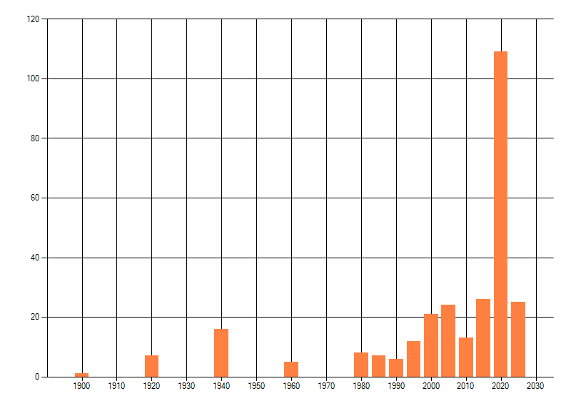 Het aantal atlasblokken (5x5 km) waarin de soort is gemeld binnen een periode van vijf jaar (vanaf 1980) of twintig jaar. Niet gecorrigeerd voor waarnemersinspanning en het aantal doorgegeven waarnemingen kan sterk variëren per periode, dus een trend in verspreiding kan hier niet direct uit worden afgelezen. Het opgegeven jaartal is het eerste jaar van de periode. Bron: gevalideerde waarnemingen uit de NDFF.