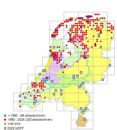 Het aantal atlasblokken (5x5 km) waarin de soort is gemeld binnen een periode van vijf jaar (vanaf 1980) of twintig jaar. Niet gecorrigeerd voor waarnemersinspanning en het aantal doorgegeven waarnemingen kan sterk variëren per periode, dus een trend in verspreiding kan hier niet direct uit worden afgelezen. Het opgegeven jaartal is het eerste jaar van de periode. Bron: gevalideerde waarnemingen uit de NDFF.
