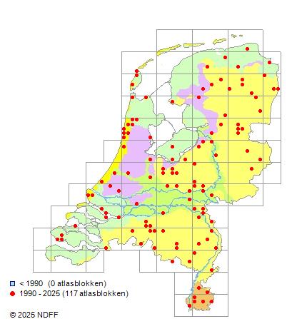 Het aantal atlasblokken (5x5 km) waarin de soort is gemeld binnen een periode van vijf jaar (vanaf 1980) of twintig jaar. Niet gecorrigeerd voor waarnemersinspanning en het aantal doorgegeven waarnemingen kan sterk variëren per periode, dus een trend in verspreiding kan hier niet direct uit worden afgelezen. Het opgegeven jaartal is het eerste jaar van de periode. Bron: gevalideerde waarnemingen uit de NDFF.