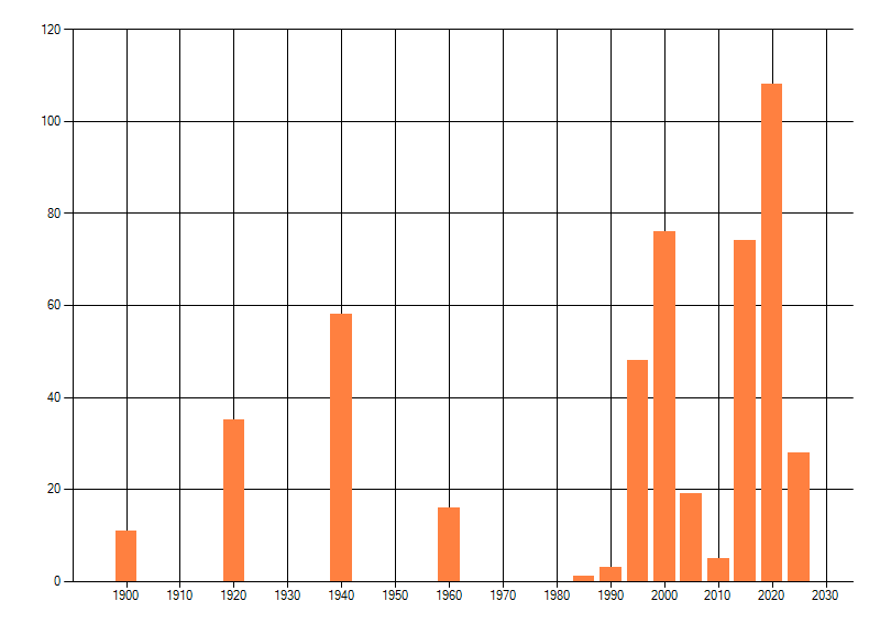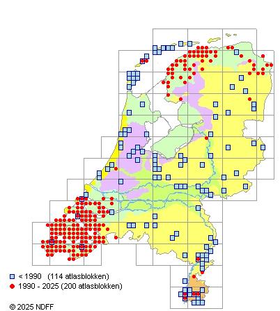Het aantal atlasblokken (5x5 km) waarin de soort is gemeld binnen een periode van vijf jaar (vanaf 1980) of twintig jaar. Niet gecorrigeerd voor waarnemersinspanning en het aantal doorgegeven waarnemingen kan sterk variëren per periode, dus een trend in verspreiding kan hier niet direct uit worden afgelezen. Het opgegeven jaartal is het eerste jaar van de periode. Bron: gevalideerde waarnemingen uit de NDFF.