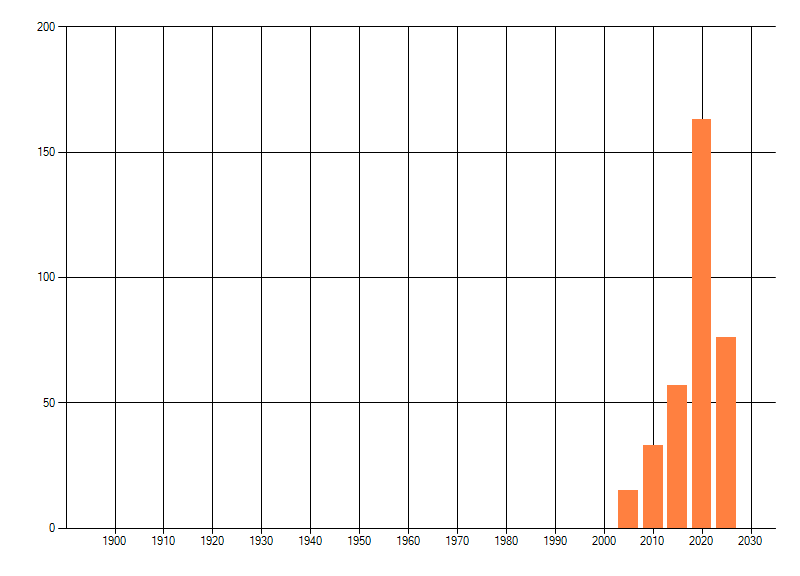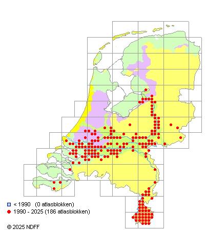 Het aantal atlasblokken (5x5 km) waarin de soort is gemeld binnen een periode van vijf jaar (vanaf 1980) of twintig jaar. Niet gecorrigeerd voor waarnemersinspanning en het aantal doorgegeven waarnemingen kan sterk variëren per periode, dus een trend in verspreiding kan hier niet direct uit worden afgelezen. Het opgegeven jaartal is het eerste jaar van de periode. Bron: gevalideerde waarnemingen uit de NDFF.