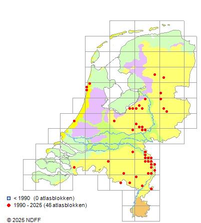Het aantal atlasblokken (5x5 km) waarin de soort is gemeld binnen een periode van vijf jaar (vanaf 1980) of twintig jaar. Niet gecorrigeerd voor waarnemersinspanning en het aantal doorgegeven waarnemingen kan sterk variëren per periode, dus een trend in verspreiding kan hier niet direct uit worden afgelezen. Het opgegeven jaartal is het eerste jaar van de periode. Bron: gevalideerde waarnemingen uit de NDFF.