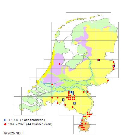 Het aantal atlasblokken (5x5 km) waarin de soort is gemeld binnen een periode van vijf jaar (vanaf 1980) of twintig jaar. Niet gecorrigeerd voor waarnemersinspanning en het aantal doorgegeven waarnemingen kan sterk variëren per periode, dus een trend in verspreiding kan hier niet direct uit worden afgelezen. Het opgegeven jaartal is het eerste jaar van de periode. Bron: gevalideerde waarnemingen uit de NDFF.