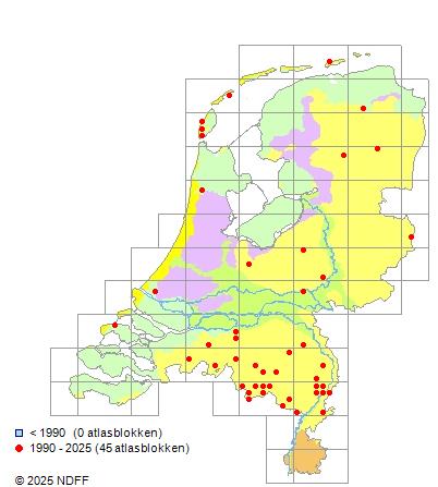 Het aantal atlasblokken (5x5 km) waarin de soort is gemeld binnen een periode van vijf jaar (vanaf 1980) of twintig jaar. Niet gecorrigeerd voor waarnemersinspanning en het aantal doorgegeven waarnemingen kan sterk variëren per periode, dus een trend in verspreiding kan hier niet direct uit worden afgelezen. Het opgegeven jaartal is het eerste jaar van de periode. Bron: gevalideerde waarnemingen uit de NDFF.