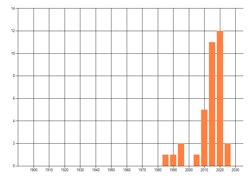 Het aantal atlasblokken (5x5 km) waarin de soort is gemeld binnen een periode van vijf jaar (vanaf 1980) of twintig jaar. Niet gecorrigeerd voor waarnemersinspanning en het aantal doorgegeven waarnemingen kan sterk variëren per periode, dus een trend in verspreiding kan hier niet direct uit worden afgelezen. Het opgegeven jaartal is het eerste jaar van de periode. Bron: gevalideerde waarnemingen uit de NDFF.