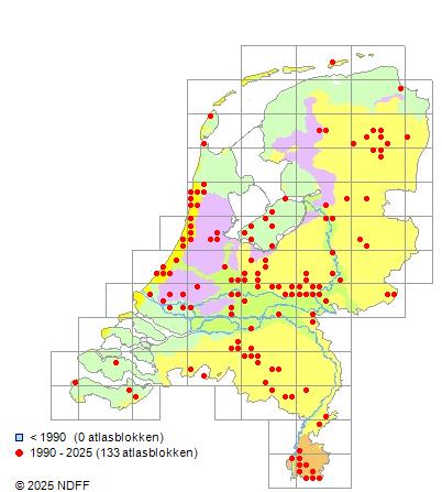 Het aantal atlasblokken (5x5 km) waarin de soort is gemeld binnen een periode van vijf jaar (vanaf 1980) of twintig jaar. Niet gecorrigeerd voor waarnemersinspanning en het aantal doorgegeven waarnemingen kan sterk variëren per periode, dus een trend in verspreiding kan hier niet direct uit worden afgelezen. Het opgegeven jaartal is het eerste jaar van de periode. Bron: gevalideerde waarnemingen uit de NDFF.