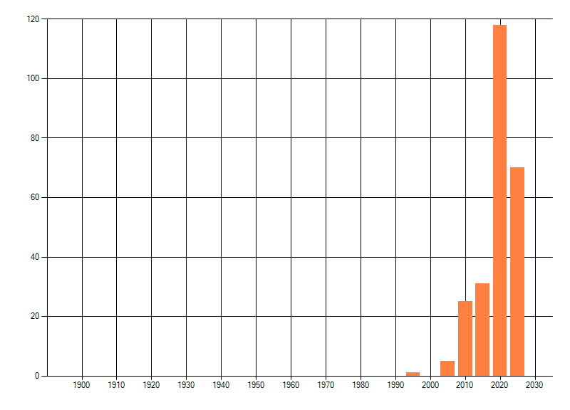 Het aantal atlasblokken (5x5 km) waarin de soort is gemeld binnen een periode van vijf jaar (vanaf 1980) of twintig jaar. Niet gecorrigeerd voor waarnemersinspanning en het aantal doorgegeven waarnemingen kan sterk variëren per periode, dus een trend in verspreiding kan hier niet direct uit worden afgelezen. Het opgegeven jaartal is het eerste jaar van de periode. Bron: gevalideerde waarnemingen uit de NDFF.