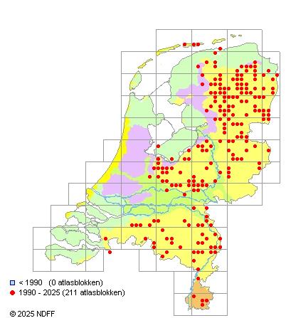 Het aantal atlasblokken (5x5 km) waarin de soort is gemeld binnen een periode van vijf jaar (vanaf 1980) of twintig jaar. Niet gecorrigeerd voor waarnemersinspanning en het aantal doorgegeven waarnemingen kan sterk variëren per periode, dus een trend in verspreiding kan hier niet direct uit worden afgelezen. Het opgegeven jaartal is het eerste jaar van de periode. Bron: gevalideerde waarnemingen uit de NDFF.