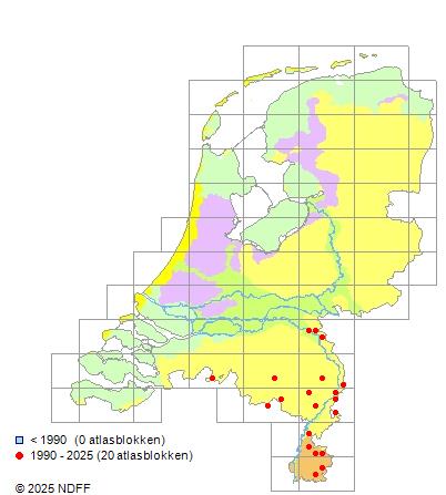 Het aantal atlasblokken (5x5 km) waarin de soort is gemeld binnen een periode van vijf jaar (vanaf 1980) of twintig jaar. Niet gecorrigeerd voor waarnemersinspanning en het aantal doorgegeven waarnemingen kan sterk variëren per periode, dus een trend in verspreiding kan hier niet direct uit worden afgelezen. Het opgegeven jaartal is het eerste jaar van de periode. Bron: gevalideerde waarnemingen uit de NDFF.