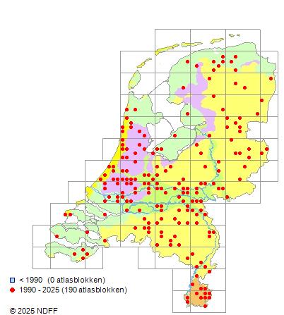 Het aantal atlasblokken (5x5 km) waarin de soort is gemeld binnen een periode van vijf jaar (vanaf 1980) of twintig jaar. Niet gecorrigeerd voor waarnemersinspanning en het aantal doorgegeven waarnemingen kan sterk variëren per periode, dus een trend in verspreiding kan hier niet direct uit worden afgelezen. Het opgegeven jaartal is het eerste jaar van de periode. Bron: gevalideerde waarnemingen uit de NDFF.