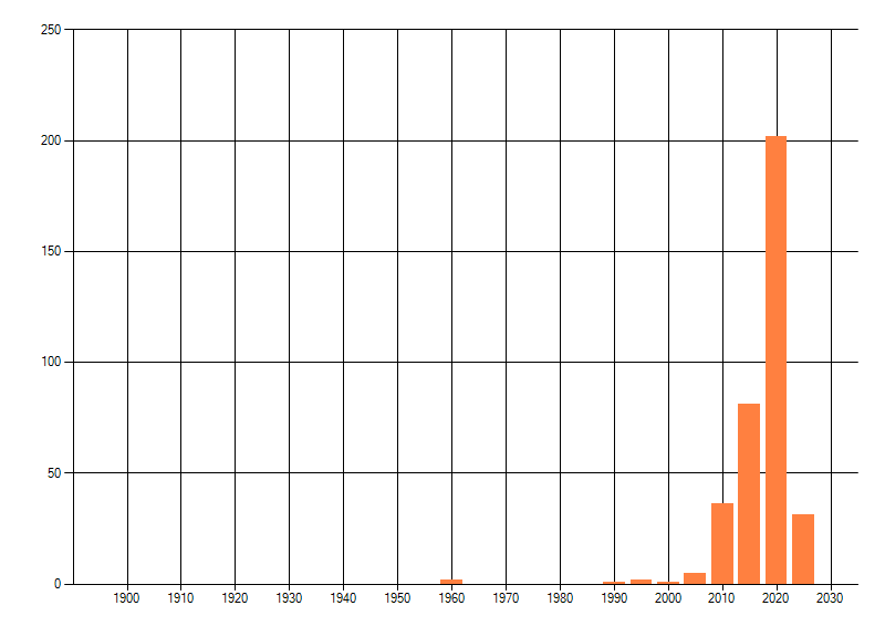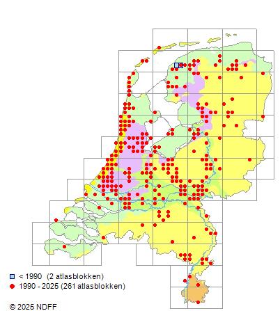Het aantal atlasblokken (5x5 km) waarin de soort is gemeld binnen een periode van vijf jaar (vanaf 1980) of twintig jaar. Niet gecorrigeerd voor waarnemersinspanning en het aantal doorgegeven waarnemingen kan sterk variëren per periode, dus een trend in verspreiding kan hier niet direct uit worden afgelezen. Het opgegeven jaartal is het eerste jaar van de periode. Bron: gevalideerde waarnemingen uit de NDFF.