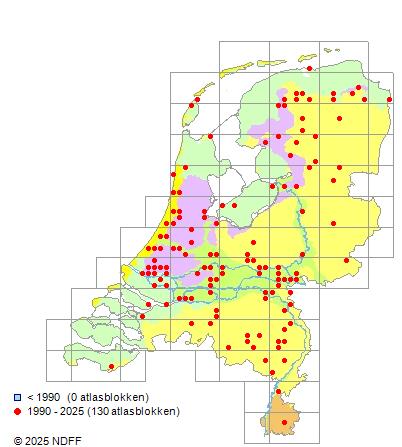 Het aantal atlasblokken (5x5 km) waarin de soort is gemeld binnen een periode van vijf jaar (vanaf 1980) of twintig jaar. Niet gecorrigeerd voor waarnemersinspanning en het aantal doorgegeven waarnemingen kan sterk variëren per periode, dus een trend in verspreiding kan hier niet direct uit worden afgelezen. Het opgegeven jaartal is het eerste jaar van de periode. Bron: gevalideerde waarnemingen uit de NDFF.