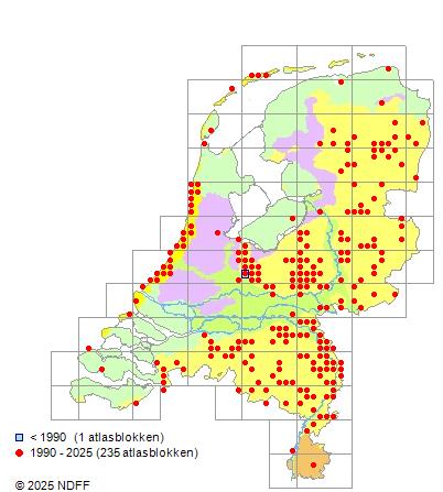 Het aantal atlasblokken (5x5 km) waarin de soort is gemeld binnen een periode van vijf jaar (vanaf 1980) of twintig jaar. Niet gecorrigeerd voor waarnemersinspanning en het aantal doorgegeven waarnemingen kan sterk variëren per periode, dus een trend in verspreiding kan hier niet direct uit worden afgelezen. Het opgegeven jaartal is het eerste jaar van de periode. Bron: gevalideerde waarnemingen uit de NDFF.