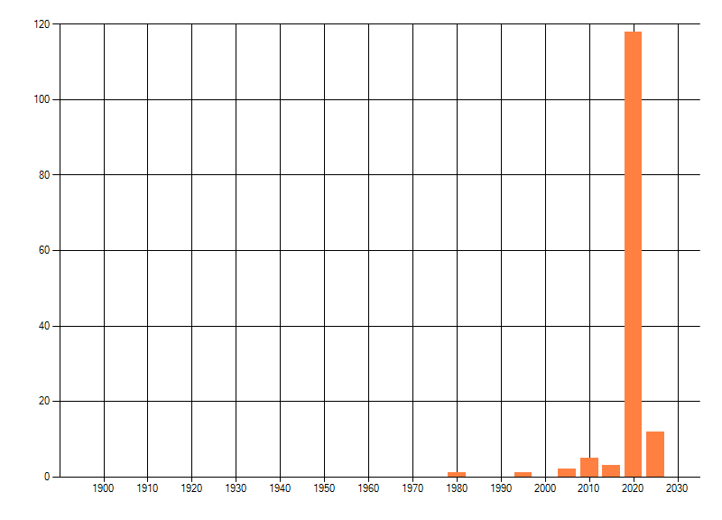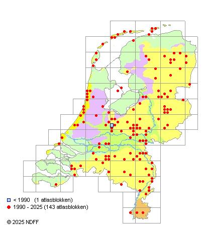 Het aantal atlasblokken (5x5 km) waarin de soort is gemeld binnen een periode van vijf jaar (vanaf 1980) of twintig jaar. Niet gecorrigeerd voor waarnemersinspanning en het aantal doorgegeven waarnemingen kan sterk variëren per periode, dus een trend in verspreiding kan hier niet direct uit worden afgelezen. Het opgegeven jaartal is het eerste jaar van de periode. Bron: gevalideerde waarnemingen uit de NDFF.