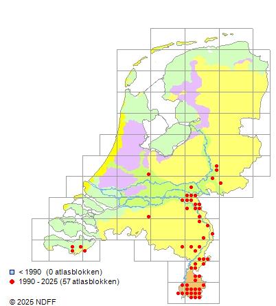 Het aantal atlasblokken (5x5 km) waarin de soort is gemeld binnen een periode van vijf jaar (vanaf 1980) of twintig jaar. Niet gecorrigeerd voor waarnemersinspanning en het aantal doorgegeven waarnemingen kan sterk variëren per periode, dus een trend in verspreiding kan hier niet direct uit worden afgelezen. Het opgegeven jaartal is het eerste jaar van de periode. Bron: gevalideerde waarnemingen uit de NDFF.
