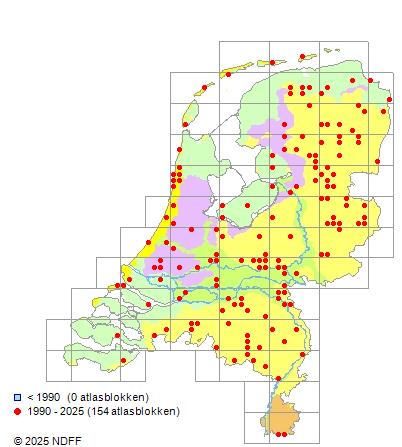 Het aantal atlasblokken (5x5 km) waarin de soort is gemeld binnen een periode van vijf jaar (vanaf 1980) of twintig jaar. Niet gecorrigeerd voor waarnemersinspanning en het aantal doorgegeven waarnemingen kan sterk variëren per periode, dus een trend in verspreiding kan hier niet direct uit worden afgelezen. Het opgegeven jaartal is het eerste jaar van de periode. Bron: gevalideerde waarnemingen uit de NDFF.