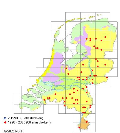 Het aantal atlasblokken (5x5 km) waarin de soort is gemeld binnen een periode van vijf jaar (vanaf 1980) of twintig jaar. Niet gecorrigeerd voor waarnemersinspanning en het aantal doorgegeven waarnemingen kan sterk variëren per periode, dus een trend in verspreiding kan hier niet direct uit worden afgelezen. Het opgegeven jaartal is het eerste jaar van de periode. Bron: gevalideerde waarnemingen uit de NDFF.