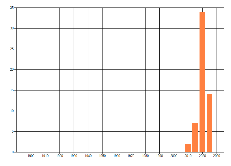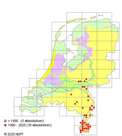 Het aantal atlasblokken (5x5 km) waarin de soort is gemeld binnen een periode van vijf jaar (vanaf 1980) of twintig jaar. Niet gecorrigeerd voor waarnemersinspanning en het aantal doorgegeven waarnemingen kan sterk variëren per periode, dus een trend in verspreiding kan hier niet direct uit worden afgelezen. Het opgegeven jaartal is het eerste jaar van de periode. Bron: gevalideerde waarnemingen uit de NDFF.