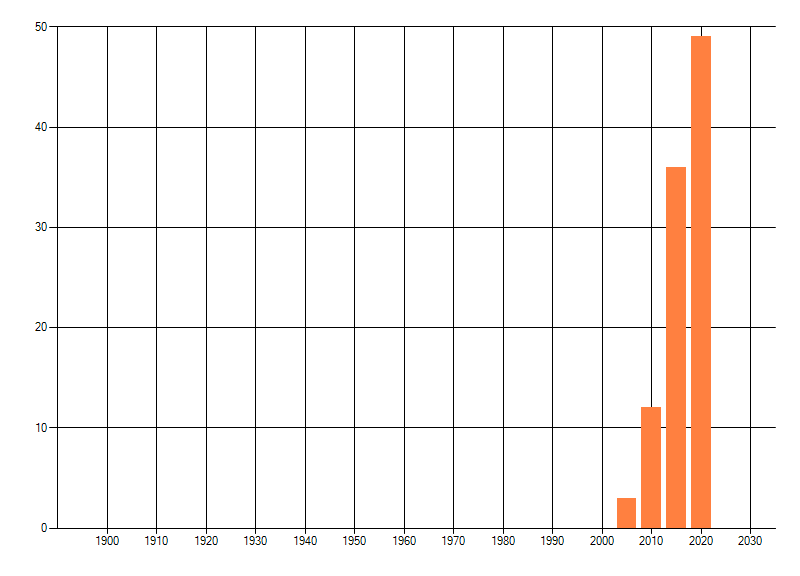 Het aantal atlasblokken (5x5 km) waarin de soort is gemeld binnen een periode van vijf jaar (vanaf 1980) of twintig jaar. Niet gecorrigeerd voor waarnemersinspanning en het aantal doorgegeven waarnemingen kan sterk variëren per periode, dus een trend in verspreiding kan hier niet direct uit worden afgelezen. Het opgegeven jaartal is het eerste jaar van de periode. Bron: gevalideerde waarnemingen uit de NDFF.