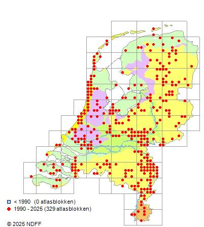Het aantal atlasblokken (5x5 km) waarin de soort is gemeld binnen een periode van vijf jaar (vanaf 1980) of twintig jaar. Niet gecorrigeerd voor waarnemersinspanning en het aantal doorgegeven waarnemingen kan sterk variëren per periode, dus een trend in verspreiding kan hier niet direct uit worden afgelezen. Het opgegeven jaartal is het eerste jaar van de periode. Bron: gevalideerde waarnemingen uit de NDFF.