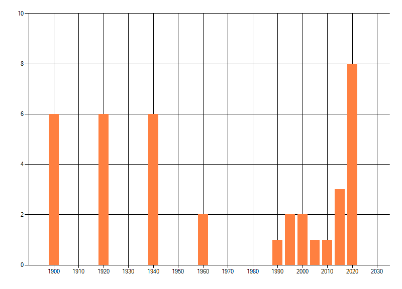Het aantal atlasblokken (5x5 km) waarin de soort is gemeld binnen een periode van vijf jaar (vanaf 1980) of twintig jaar. Niet gecorrigeerd voor waarnemersinspanning en het aantal doorgegeven waarnemingen kan sterk variëren per periode, dus een trend in verspreiding kan hier niet direct uit worden afgelezen. Het opgegeven jaartal is het eerste jaar van de periode. Bron: gevalideerde waarnemingen uit de NDFF.