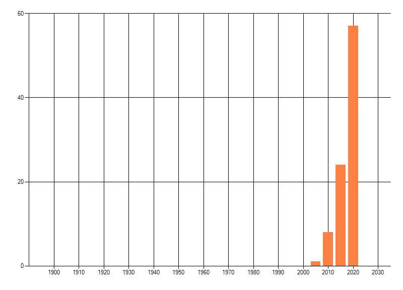 Het aantal atlasblokken (5x5 km) waarin de soort is gemeld binnen een periode van vijf jaar (vanaf 1980) of twintig jaar. Niet gecorrigeerd voor waarnemersinspanning en het aantal doorgegeven waarnemingen kan sterk variëren per periode, dus een trend in verspreiding kan hier niet direct uit worden afgelezen. Het opgegeven jaartal is het eerste jaar van de periode. Bron: gevalideerde waarnemingen uit de NDFF.