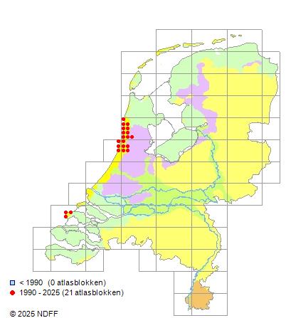 Het aantal atlasblokken (5x5 km) waarin de soort is gemeld binnen een periode van vijf jaar (vanaf 1980) of twintig jaar. Niet gecorrigeerd voor waarnemersinspanning en het aantal doorgegeven waarnemingen kan sterk variëren per periode, dus een trend in verspreiding kan hier niet direct uit worden afgelezen. Het opgegeven jaartal is het eerste jaar van de periode. Bron: gevalideerde waarnemingen uit de NDFF.
