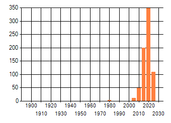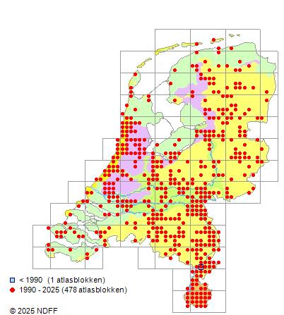 Het aantal atlasblokken (5x5 km) waarin de soort is gemeld binnen een periode van vijf jaar (vanaf 1980) of twintig jaar. Niet gecorrigeerd voor waarnemersinspanning en het aantal doorgegeven waarnemingen kan sterk variëren per periode, dus een trend in verspreiding kan hier niet direct uit worden afgelezen. Het opgegeven jaartal is het eerste jaar van de periode. Bron: gevalideerde waarnemingen uit de NDFF.