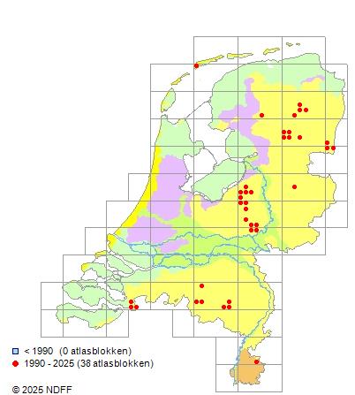 Het aantal atlasblokken (5x5 km) waarin de soort is gemeld binnen een periode van vijf jaar (vanaf 1980) of twintig jaar. Niet gecorrigeerd voor waarnemersinspanning en het aantal doorgegeven waarnemingen kan sterk variëren per periode, dus een trend in verspreiding kan hier niet direct uit worden afgelezen. Het opgegeven jaartal is het eerste jaar van de periode. Bron: gevalideerde waarnemingen uit de NDFF.