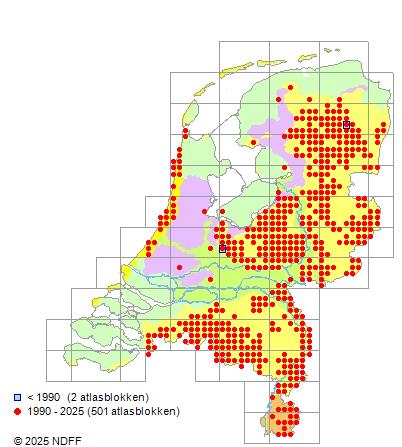 Het aantal atlasblokken (5x5 km) waarin de soort is gemeld binnen een periode van vijf jaar (vanaf 1980) of twintig jaar. Niet gecorrigeerd voor waarnemersinspanning en het aantal doorgegeven waarnemingen kan sterk variëren per periode, dus een trend in verspreiding kan hier niet direct uit worden afgelezen. Het opgegeven jaartal is het eerste jaar van de periode. Bron: gevalideerde waarnemingen uit de NDFF.