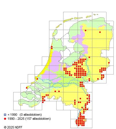 Het aantal atlasblokken (5x5 km) waarin de soort is gemeld binnen een periode van vijf jaar (vanaf 1980) of twintig jaar. Niet gecorrigeerd voor waarnemersinspanning en het aantal doorgegeven waarnemingen kan sterk variëren per periode, dus een trend in verspreiding kan hier niet direct uit worden afgelezen. Het opgegeven jaartal is het eerste jaar van de periode. Bron: gevalideerde waarnemingen uit de NDFF.