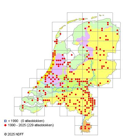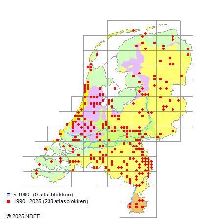 Het aantal atlasblokken (5x5 km) waarin de soort is gemeld binnen een periode van vijf jaar (vanaf 1980) of twintig jaar. Niet gecorrigeerd voor waarnemersinspanning en het aantal doorgegeven waarnemingen kan sterk variëren per periode, dus een trend in verspreiding kan hier niet direct uit worden afgelezen. Het opgegeven jaartal is het eerste jaar van de periode. Bron: gevalideerde waarnemingen uit de NDFF.